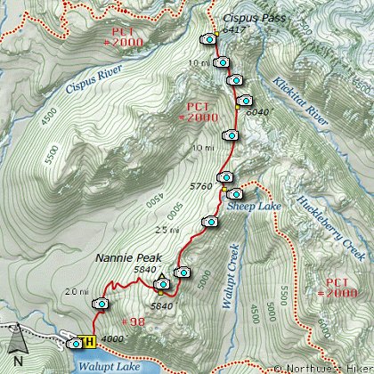 and up a steep hill for another 5.2 miles to Walupt Lake. There is a campground on