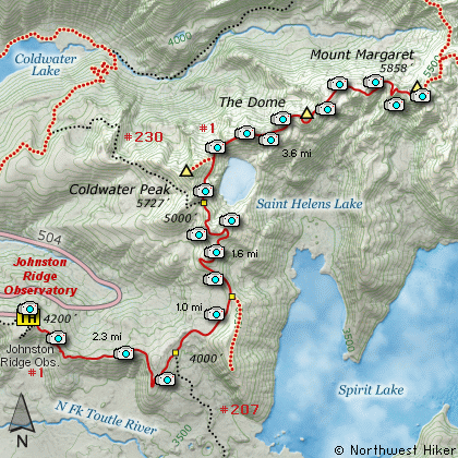 The hike follows the Boundary trail from the Johnston Ridge Observatory