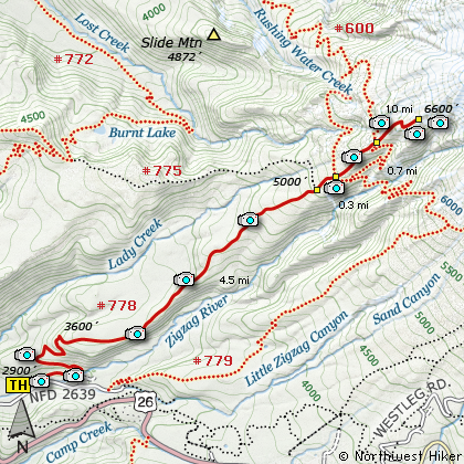 surrounding hills and valleys. At 4.5 miles you intersect Trail #775 to Burnt Lake. Then