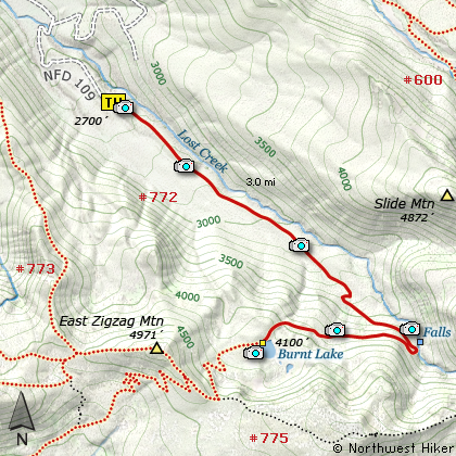 on the trail to Burnt Lake. See the map above for reference to the falls.
