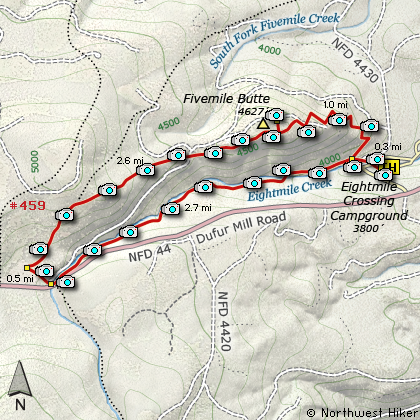present it as a loop hike, beginning and ending at Eightmile Campgrounds.