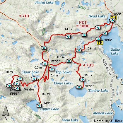 At about a mile and a half you come to the intersection of the Red Lake Trail #719 and the PCT #2000. Keep straight ahead on #2000 which will take you past a small alpine lake just off the trail a bit. You'll see where other have walked to the lake for great photo opts of the lake and of Double Peaks. Back on the trail, and you will walk just a short distance and you will come to the junction of the trail down to Top Lake. Bear right at this point and continue to Cigar Lake.